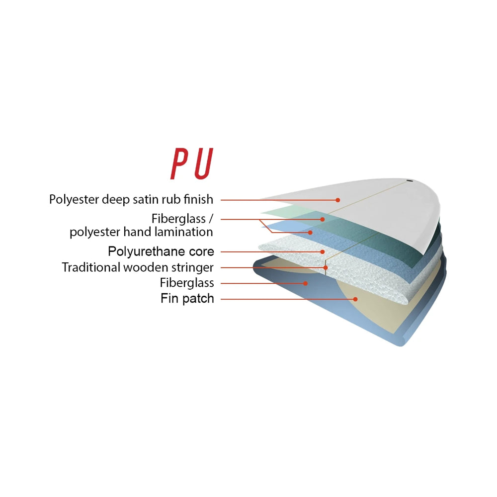 • Wood center stringer for strength, flex and rigidity, tying together the traditional PU build