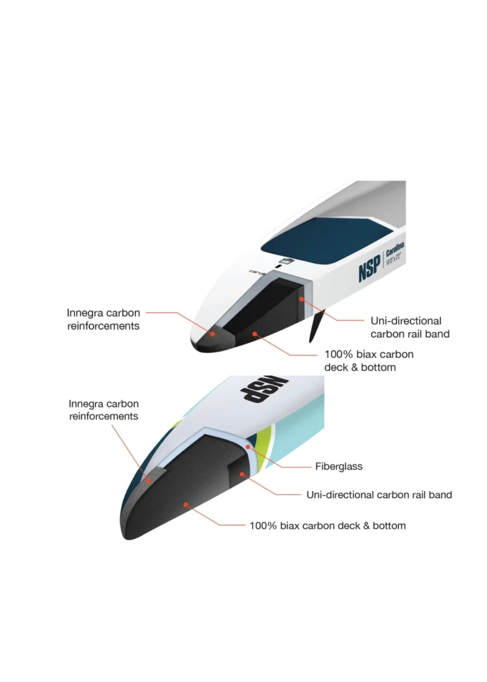 – Featuring a PVC reinforced deck for integrity plus carbon rails for stiffness reducing flex and making the board ultra responsive.
